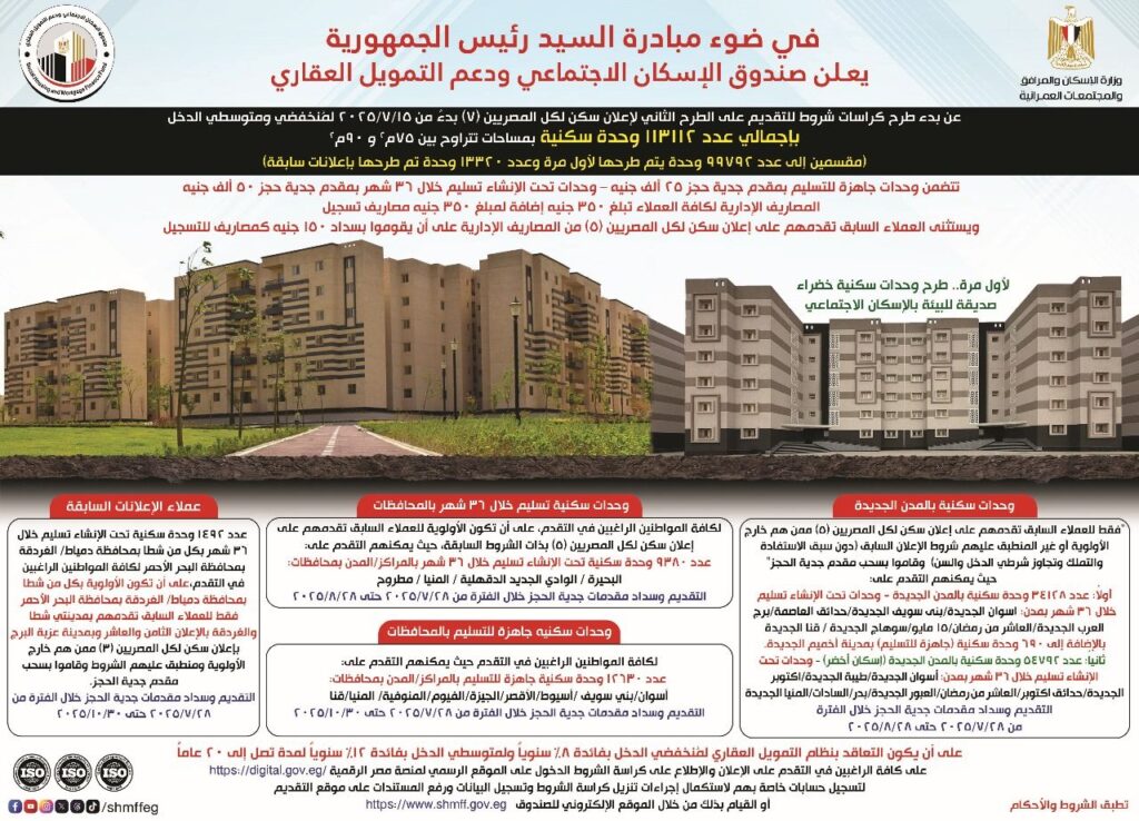 الوحدات مطروحة للمصريين فقط وتنطبق عليهم حدود معينة للدخل الشهري أو السنوي حسب الإعلان، وأي حد خارج الحدود دي ماينفعش يقدم، أو طلبه هيترفض.