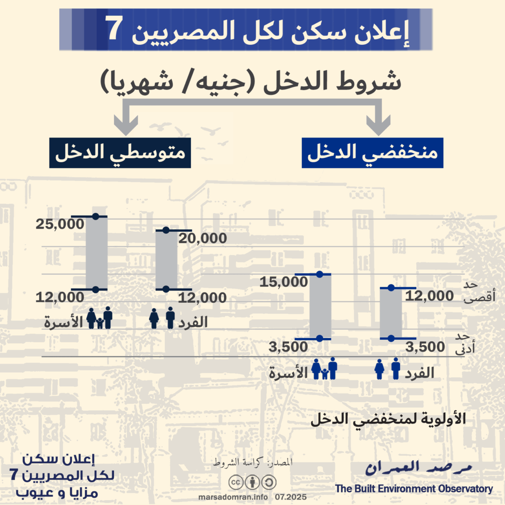 - محدودي الدخل: لازم يكون الدخل بين 3500 و12 ألف جنيه شهريًّا للفرد وبين 3500 و15 ألف جنيه شهريًّا للأسرة ولهم الأولوية في التقديم على متوسطي الدخل. كما يجب أن يكون سن المتقدم بين 21 سنة و50 سنة.