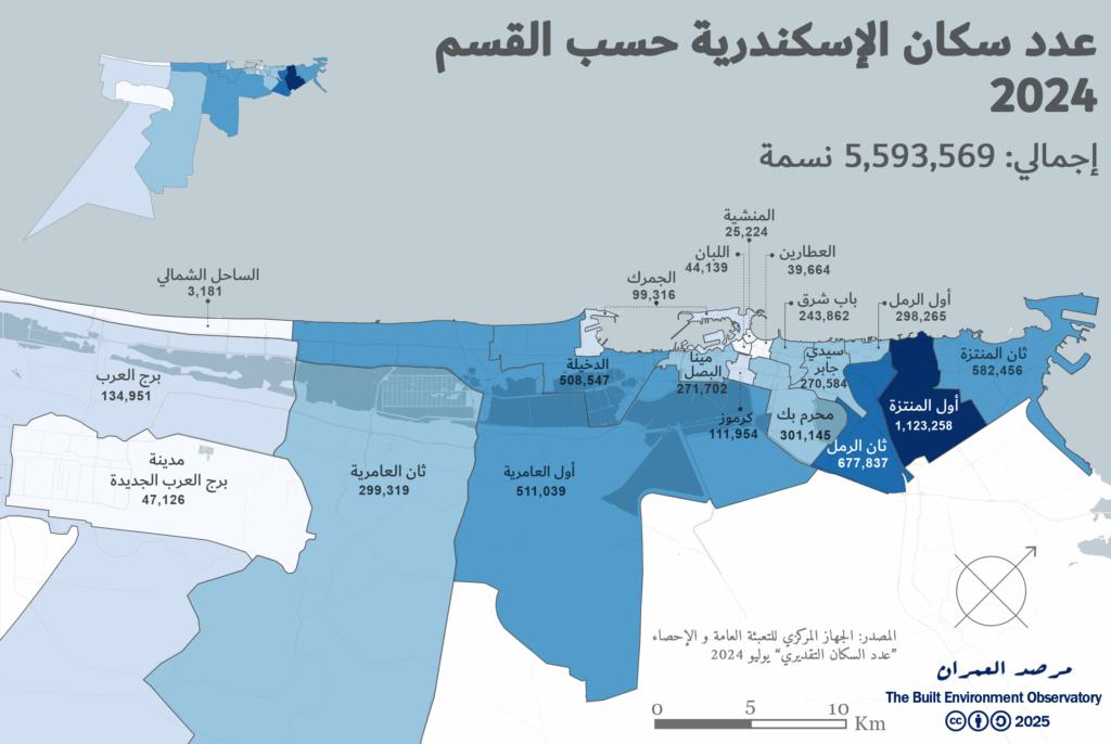 وبإلقاء نظرة سريعة على المدينة اليوم، يتضح أن قسم أول المنتزه يضم أعلى عدد سكان، حيث بلغ عدد سكانه حوالي 1.1 مليون نسمة بحلول عام 2024، أي ما يعادل خُمس إجمالي سكان المدينة. تُشكل الأقسام الشرقية مجتمعةً ثلثي سكان الإسكندرية، بينما تُمثل الأقسام الغربية 28% منهم. ووفقًا لأحدث تقديرات السكان، يُعدّ قِسمَي برج العرب ومدينة برج العرب الجديدة الأقلّ كثافة سكانية دومًا؛ إذ بلغ عدد سكان الأول نحو 135 ألف نسمة، بينما لم يتجاوز عدد سكان الثاني 47 ألف نسمة، ويمثلان معًا نحو 3% فقط من إجمالي سكان المدينة (الشكل 5). أما قسم الساحل الشمالي الذي يضم بيوت الإجازات في الغالب، فلم يتجاوز عدد سكانه 3000 نسمة.