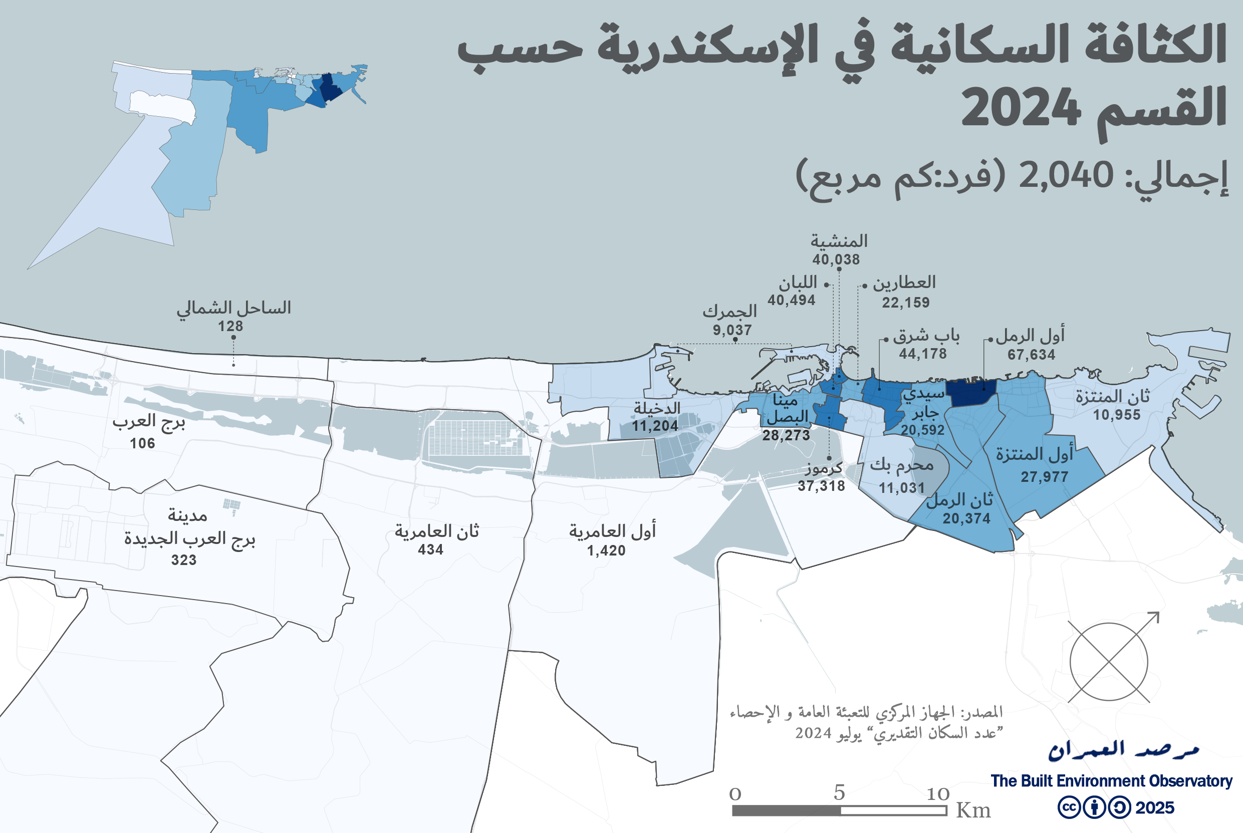 الشكل 7: الكثافة السكانية في الإسكندرية حسب التقسيم الإداري لعام 2024 (الملحق 4)
