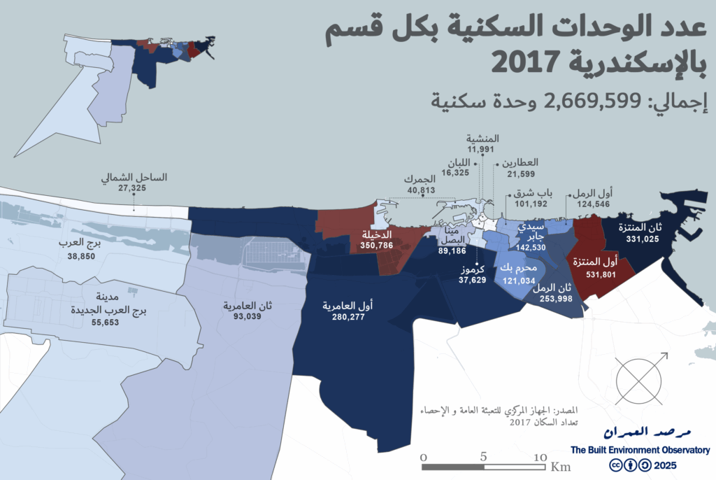وفقًا لتعداد عام 2017، بلغ عدد الوحدات السكنية في الإسكندرية 2.6 مليون وحدة. ومن بين هذه الوحدات، كان 32% منها يقع في قسمي المنتزه 1 و2، بينما كان قسم الدخيلة يمثل 13% (الملحق 5). على الرغم من أن قسم برج العرب يغطي 46٪ من إجمالي مساحة المدينة، إلا أنه لا يضم سوى 1.5٪ من الوحدات السكنية، وذلك بسبب طابعه الزراعي والصحراوي.