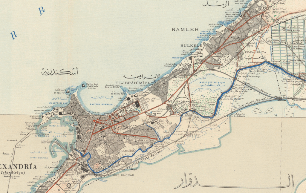 The growth of Alexandria in the late 19th century is evident when comparing Müller’s 1855 map with the Alexandria Municipality’s 1902 map. 5 The city expanded south, east, and west, with significant development particularly around Kom Al-Shoqafa. By 1855, Alexandria had already occupied Pharos Island to the north, but urban expansion southward did not reach the Mahmudiyya Canal’s southern edge. In the east, urbanisation towards Muharam Bek was less intense, with Al-Farkha Canal marking its eastern boundary. The western extension was limited, not continuing beyond Gabbari and Al-Mafrouza, and did not reach Wardian. The 1897 census recorded few inhabitants in Wardian, Al-Mex, and Al-Dikhila, primarily consisting of nomadic travellers. In the east, Al-Raml’s urbanisation was characterised by rural settlements, and these areas remained separate from the main city until later considered suburbs of Alexandria.6 In 1854, the construction of a railway line connecting Alexandria to Cairo, and later to Suez, is regarded as the real beginning of the second phase of Alexandria’s expansion in the modern era.7 By 1860, Al-Raml’s population remained under 500, but the railway line spurred growth and integration with Alexandria and subsequently transformed into a tram line.8 This urban development led to the establishment of essential public utilities such as electricity (1869), modern water supply (1879) and sewage systems (1878) and a municipal council in 1890.9