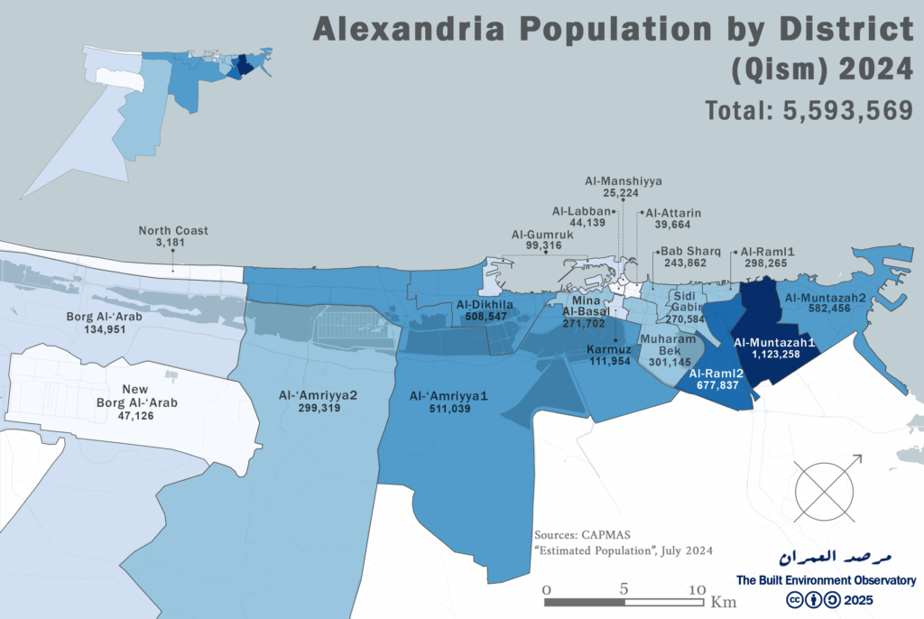 The population distributions in Alexandria have varied since the second half of the 20th century, based on eight censuses from 1947 to 2024. By 1960 and 1966, Alexandria had nearly 1.5 million inhabitants, disaggregated into 35% in the old areas of al-Manshiyaa, al-Attarin, Karmuz, Labban, and al-Gumruk, 55% in the eastern qisms of Al-Muntazah, Al-Raml, Bab Sharq, and Muharam Bek. Between 1976 and 1996, the proportion of residents in the old core of the city decreased significantly from 23% to 10%. The western qisms maintained a steady share of about 17%, with noticeable growth in Al-‘Amriyya and Al-Dikhila sections by 1996. In contrast, the eastern qisms increased their share to 65% of the population by the end of this period, boosted by a remarkable rise in Al-Muntazah qism from 13% to 26% because it still had large strips of agricultural and undeveloped land and was attracting permanent residents and seasonal tourists, alongside a decline in Muharam Bek from 15% to only 9% of the population. The first quarter of the 21st century has seen Alexandria’s inexorable growth continue, with 1.6 million people added between 2006 and 2024, and the central core retaining only 7% of the city’s inhabitants.